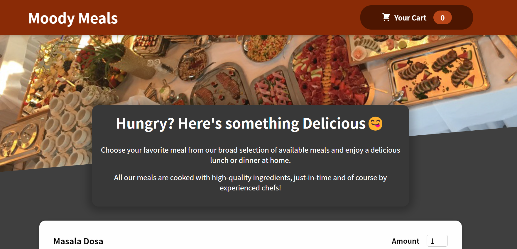 Moody meals is a food ordering website where users can find a list of different food items and order them by selecting their amount and adding them to the cart.It has a nice animation and it's a fully responsive website.